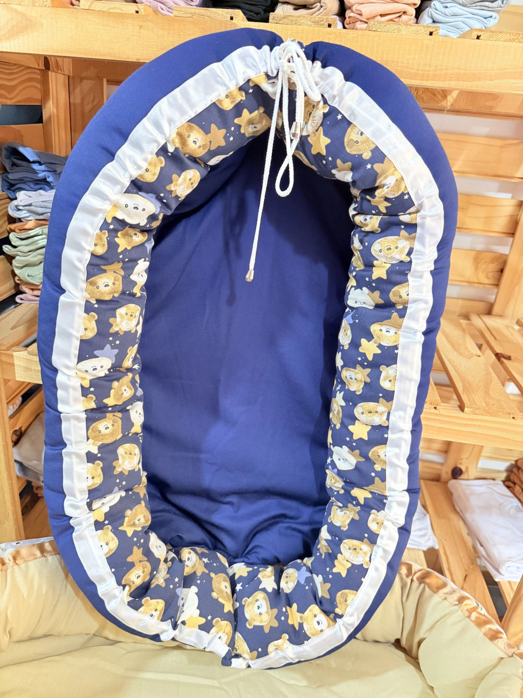Nido de contencion confeccionado: en gabardina y algodon relleno con vellon siliconado, con cordon de ajuste y ganchos metalicos.